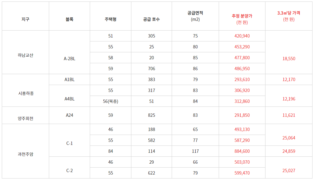 - 3.3m2(평)당으로는 하남교산ㆍ시흥하중ㆍ양주회천이 11,621~18,550 천원, 과천주암은 24,859~25,064천원 수준이 될 전망이다.