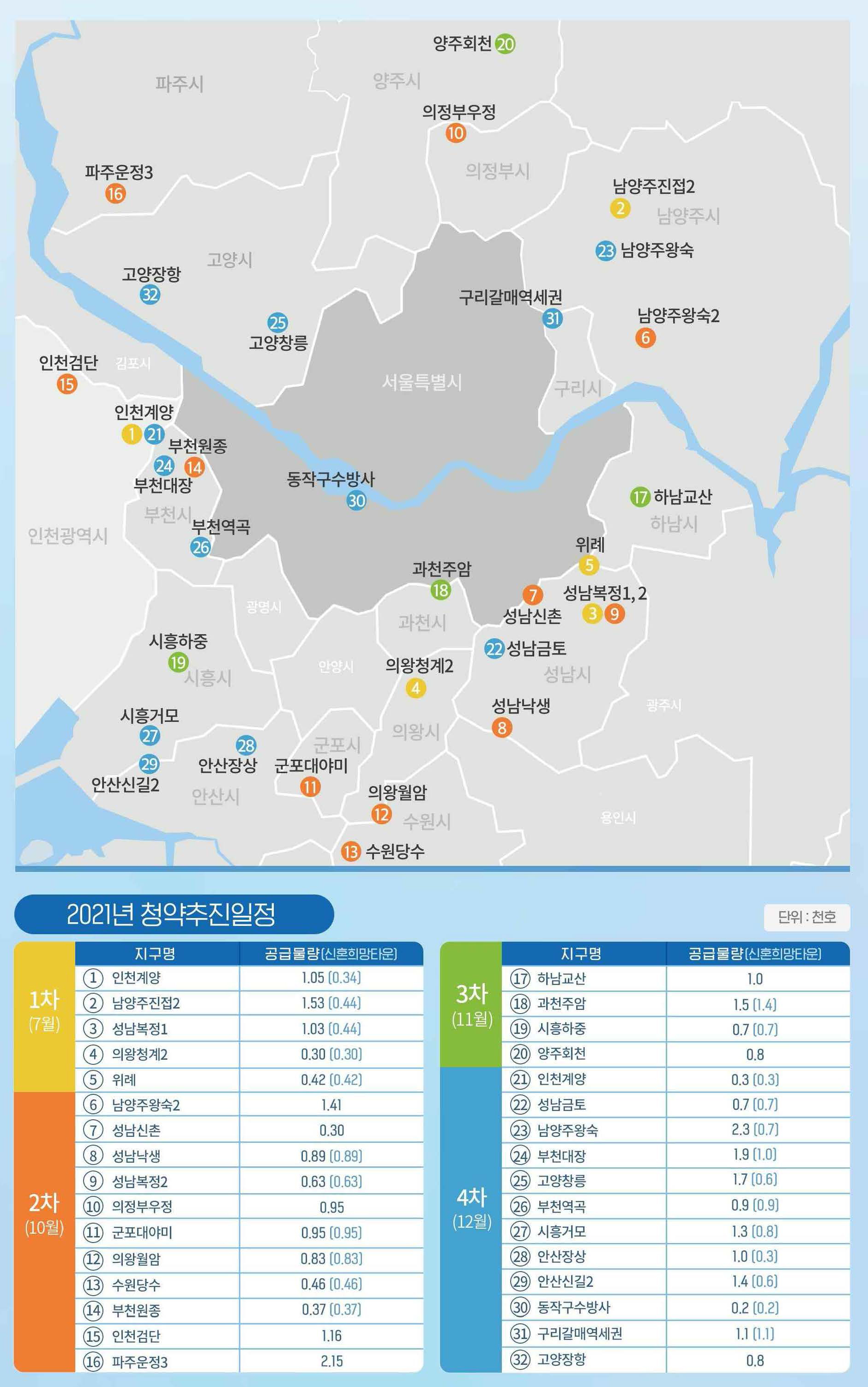 - 다음 달에는 남양주왕숙ㆍ부천대장ㆍ고양창릉 등 3기 신도시 5천 9백호와 구리갈매역세권(1.1천호)ㆍ안산신길2(1.4천호) 등의 입지에 서도 사전청약이 진행