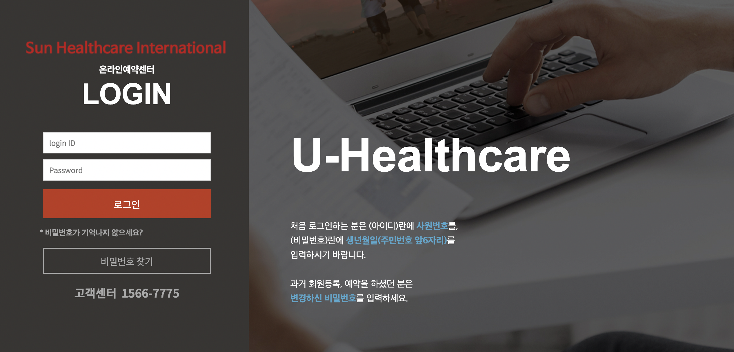 처음 이용하시는 분들은 사원번호를 (비밀번호)란에 생년월일(주민번호 앞6자리)를 입력하시기 바랍니다. 과거 회원등록, 예약을 하셨던 분들은 변경하신 비밀번호를 입력하시면 됩니다.