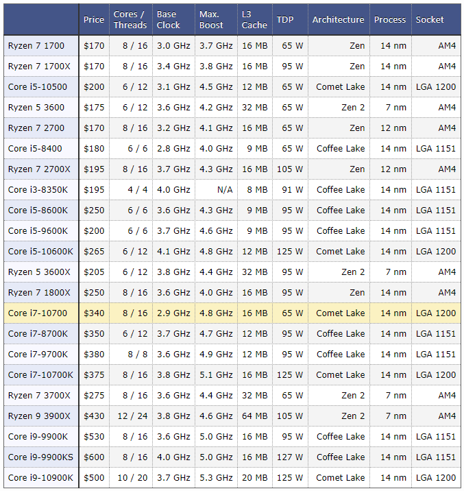 이 칩은 16MB의 L3 캐시를 탑재한 8코어/16스레드 프로세서로 지난 세대의 Core i9-9900과 일치하지만 10700은 "Core i7" 등급이기 때문에 매력적인 사양 시트입니다.