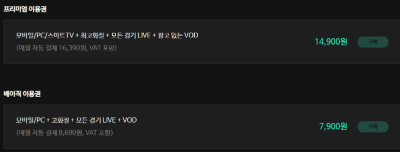 스포티비 나우는 프리미엄 이용권 / 베이직 이용권 두가지 이용권이 있습니다.