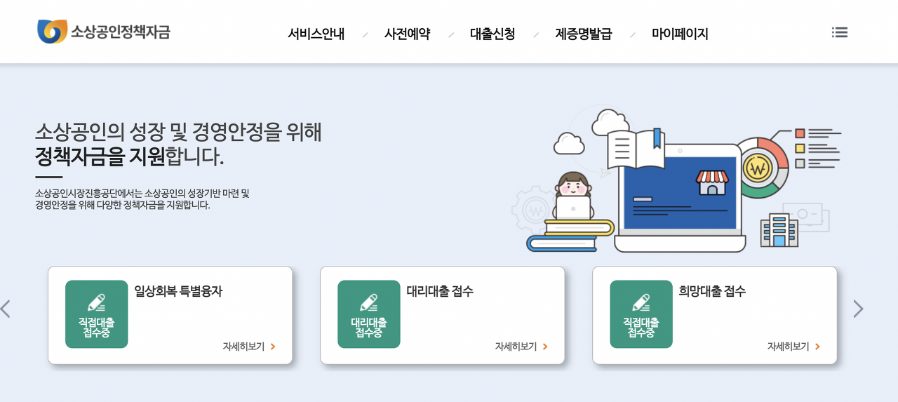 소상공인 진흥공단 홈페이지 접속 후 신용점수 사전 조회에서 본인의 신용점수를 확인합니다. 그리고 희망대출 접수에 들어가서 직접대출 접수를 진행하시면 됩니다.