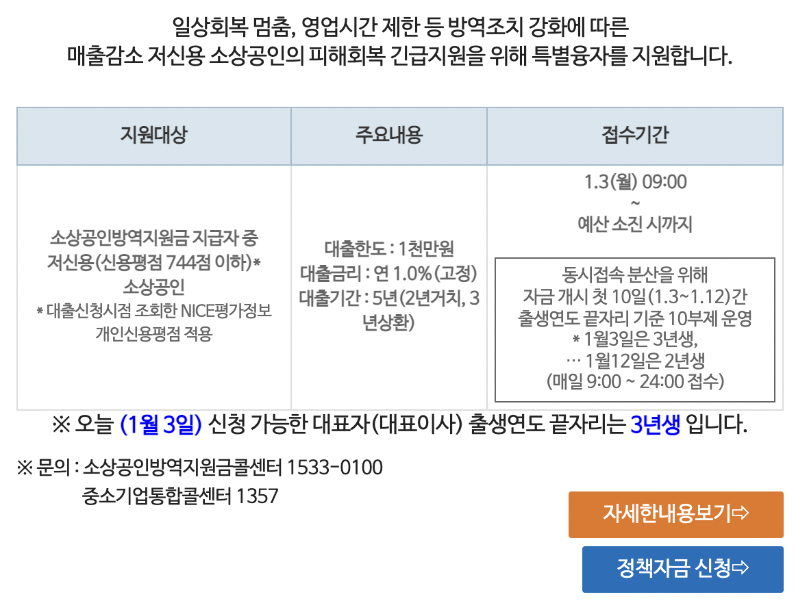지난해 11월 29일부터 시행 중인 '일상회복 특별융자'(1% 금리·2천만원 한도)를 지원받은 경우는 중복으로 신청할 수 없다.