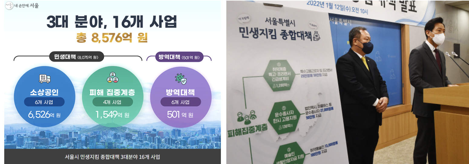 서울시에서 코로나19 방역을 위한 정부의 방역조치 강화로 인한 영업시간 제한으로 어려움을 겪고 있는 소상공인과 자영업자 50만명에게 '소상공인 지킴자금'을 업체당 100만원씩 지급합니다. 이번 지원대책은 정부의 손실보상 틈새를 메우는데 방점을 두었고