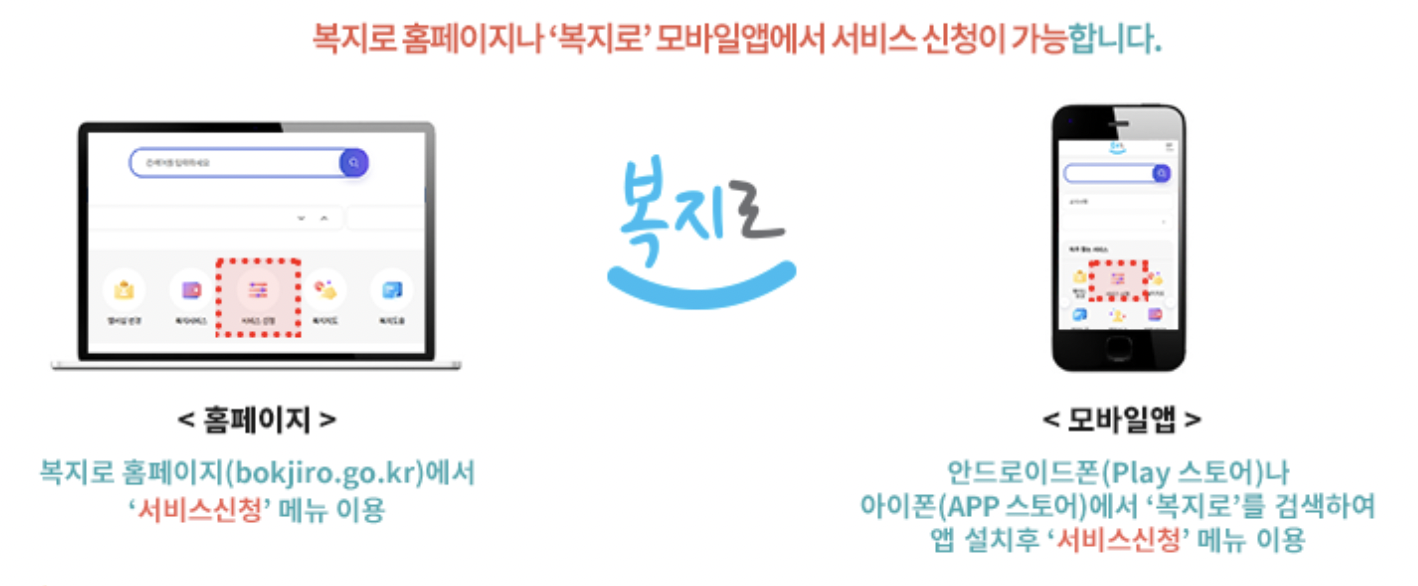 복지로 홈페이지나 '복지로'모바일앱에서 서비스 신청이 가능 합니다.