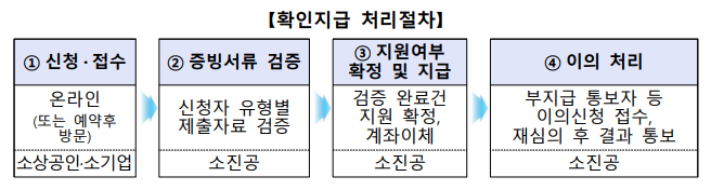 증빙서류를 온라인으로 제출 후 소상공인시장진흥공단 (이하 “소진공”)에서 확인 · 검증을 거쳐 지급