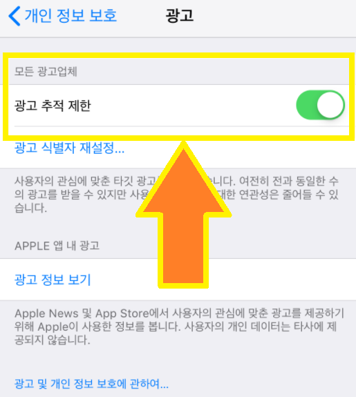 위에 설정 부분 하부를 보시면 Apple 앱 내 광고라고 해서 '사용자의 관심에 맞춘 타깃 광고를 받지 않습니다. 여전히 전과 동일한 수의 광고를 받을 수 있지만 사용자의 관심사에 대한 연관성은 줄어들 수 있습니다.'라는 안내문도 같이 적혀 있으니 참조하세요.