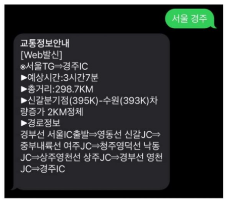 아래 문자 예시 사진 처럼 출발, 도착 순으로 문자를 보내면