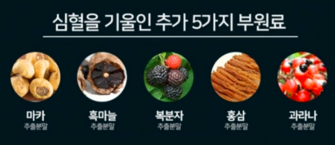 부원료로는 마카, 흑마늘, 복분자, 홍삼, 과라나 가 들어가있다고 합니다,