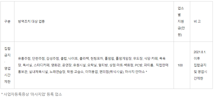 - 중앙재난안전대책본부의 사회적 거리두기(2021.8.1.이후) 방역조치에 따라 집합금지 또는 영업시간제한 행정명령을 이행한 소상공인 [단, 신청요건을 갖추어야 함]