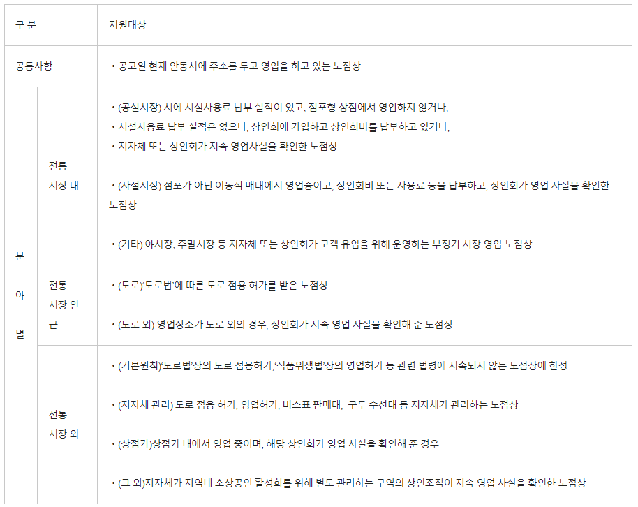 - (소재지등) 공고일 기준 사업장소재지를 안동시에 두고 신청일 현재 계속 영업중인 사업자등록(인허가업소 포함)된 소상공인